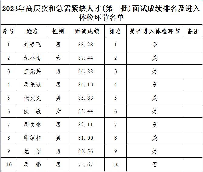 附件:2023年高层次和急需紧缺人才(第一批)面试成绩排名及进入体检环节名单